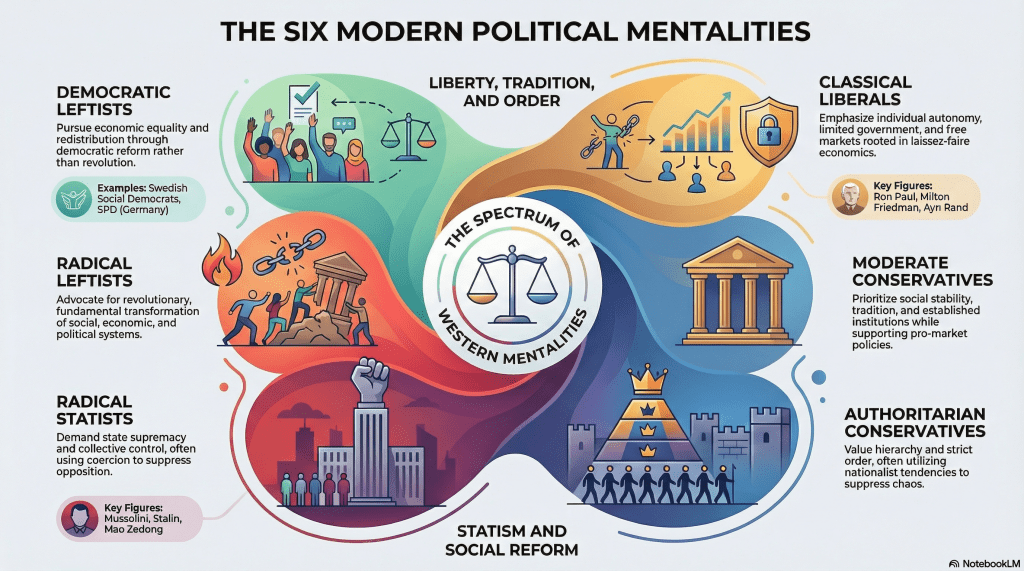 • Research suggests that political mindsets can be grouped into six categories, forming a circular diagram: classical liberals, moderate conservatives, authoritarian conservatives, fascists, radical leftists, and democratic leftists.