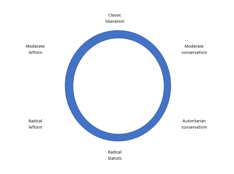 This model suggests that political ideals (or ideologies) are not adequately represented in a straight line, but rather relate to mindsets organized in a circle where adjacent groups share ideas and characteristics, while opposing groups are fundamentally opposed, representing fundamental conflicts.