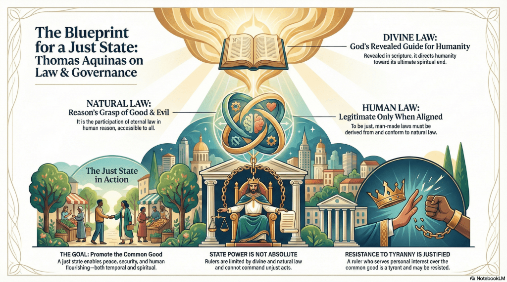 In political terms, human laws must align with natural and divine law to be legitimate, reflecting universal moral principles. For example, in the Summa Theologica (ST I-II q. 90 a. 2), he argues that law “is nothing more than an ordinance of reason for the common good, promulgated by the head of the community,” guided by divine reason.