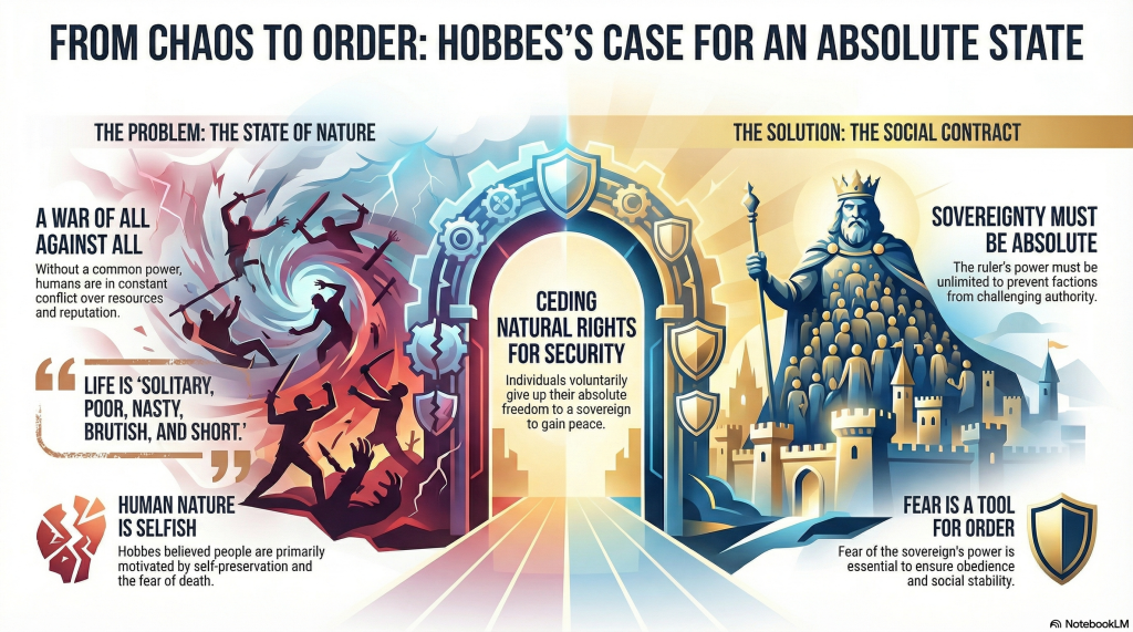 Hobbes’s ideas revolve around fundamental concepts that challenge previous views, such as those of Aristotle and Thomas Aquinas, which saw the state as a means to the common good or virtue. Instead, Hobbes argued that the state must be absolute, with unlimited power, to prevent chaos. His key concepts include: