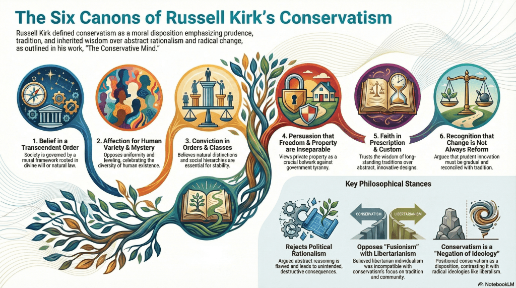 At the heart of Kirk’s ideas are six “canons” of conservative thought, which he outlines early in the book as guiding principles. These are not rigid dogmas but a synthesis of enduring values drawn from historical conservatives: