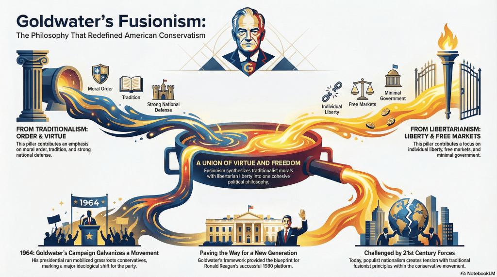 Fusionism, as associated with Barry Goldwater, refers to a political philosophy that synthesizes traditional conservatism’s emphasis on moral order, tradition, and national defense with libertarianism’s focus on individual liberty, free markets, and minimal government intervention.