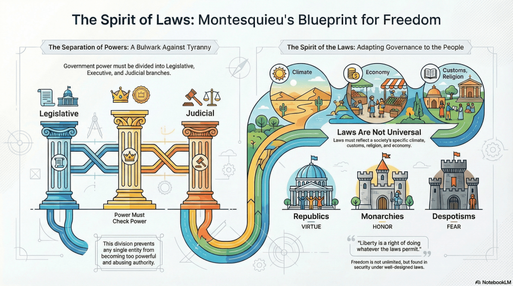 This separation, combined with checks and balances, ensures that power remains diffuse, preventing tyranny. Montesquieu’s admiration for the English constitution, particularly after the Glorious Revolution, inspired this model, as he saw England’s balanced system as a bulwark against absolutism.