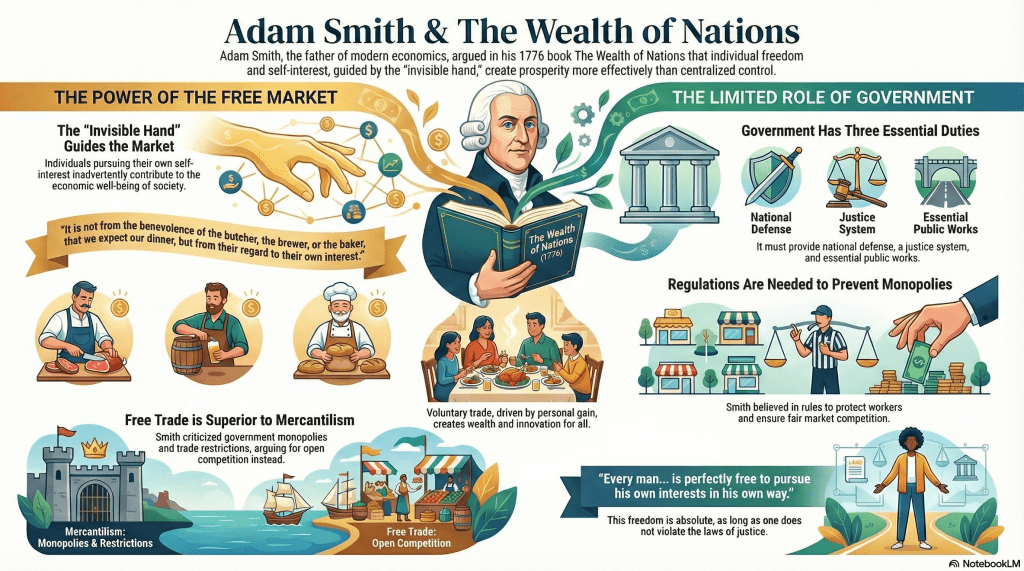 Smith’s vision of markets as engines of prosperity and freedom continues to shape economic thought, reminding us that individual freedom and social wealth are closely intertwined.