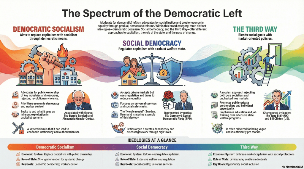The three ideologies—social democracy, democratic socialism, and the Third Way—represent variations of leftist thought, all emphasizing social justice, economic equality, and democratic governance. They emerged from socialist traditions but differ in their approaches to capitalism, the role of the state, and the pace of reforms. Democratic Socialism seeks a fundamental shift toward collective ownership through democratic means, Social Democracy aims to mitigate the inequalities of capitalism through welfare reforms, and the Third Way modernizes social democracy by integrating market-oriented policies for a globalized world.