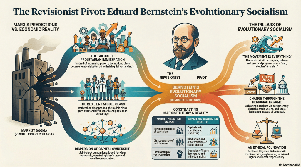 - Rejection of Marxist Determinism: Bernstein challenged Karl Marx’s predictions, arguing that capitalism was not inevitably collapsing due to internal contradictions. Instead, he observed that capitalism was adapting and stabilizing, with phenomena like the growth of joint-stock companies dispersing ownership, the persistence of small and medium-sized enterprises, and rising living standards for the working class, countering Marx’s theory of proletarian immiseration (increasing poverty).