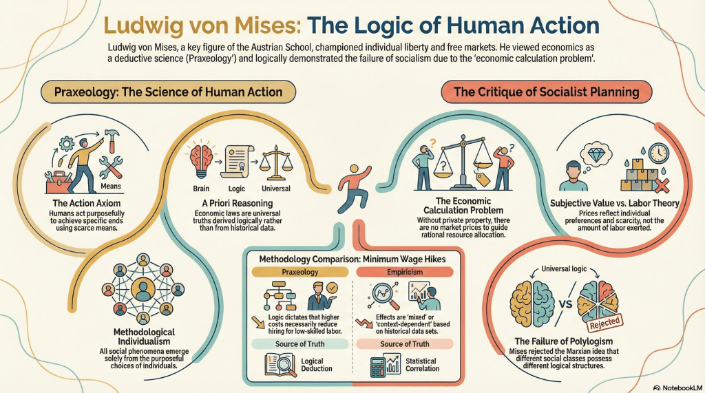 Ludwig von Mises (1881–1973) was an Austrian economist, and a leading figure of the Austrian School. Trained in Vienna, he served as a government advisor and later taught and wrote extensively, especially after emigrating to the United States during World War II. Mises combined rigorous theoretical argumentation with a vigorous defense of classical liberalism, championing individual liberty, private property, and free markets.