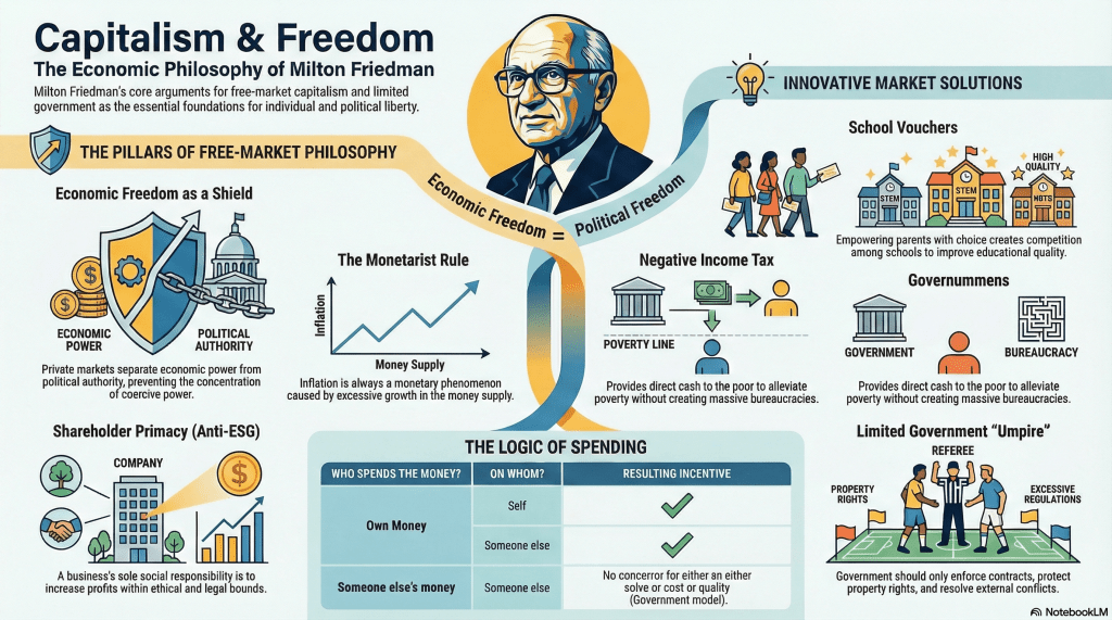 The book, inspired by lectures at the University of Chicago, combines economic theory with policy prescriptions to show how free markets decentralize power and protect individual liberties. Here’s an overview of its key arguments: