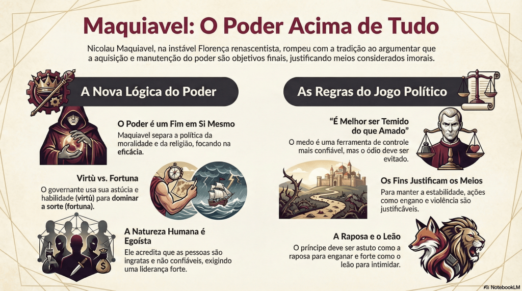 - Machiavelli prioriza a eficácia política sobre a moralidade, defendendo que o poder justifica meios como engano e crueldade.