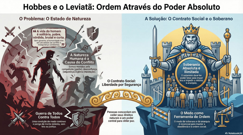 Hobbes testemunhou de perto os efeitos devastadores da guerra civil, vendo-a como um exemplo do “estado de natureza”, uma condição hipotética onde os seres humanos, sem um poder central, vivem em constante conflito devido à competição por recursos e à ausência de segurança. Ele serviu como tutor e secretário de nobres ingleses, mas, como monarquista, fugiu para a França para evitar perseguições dos parlamentaristas. Durante esse exílio, escreveu Leviatã, um tratado que defende a necessidade de um soberano absoluto para manter a ordem social. Sua experiência foi moldada também por influências científicas, como a filosofia indutiva de Francis Bacon e o método geométrico, que ele aplicou à política, buscando criar uma “ciência da política”.