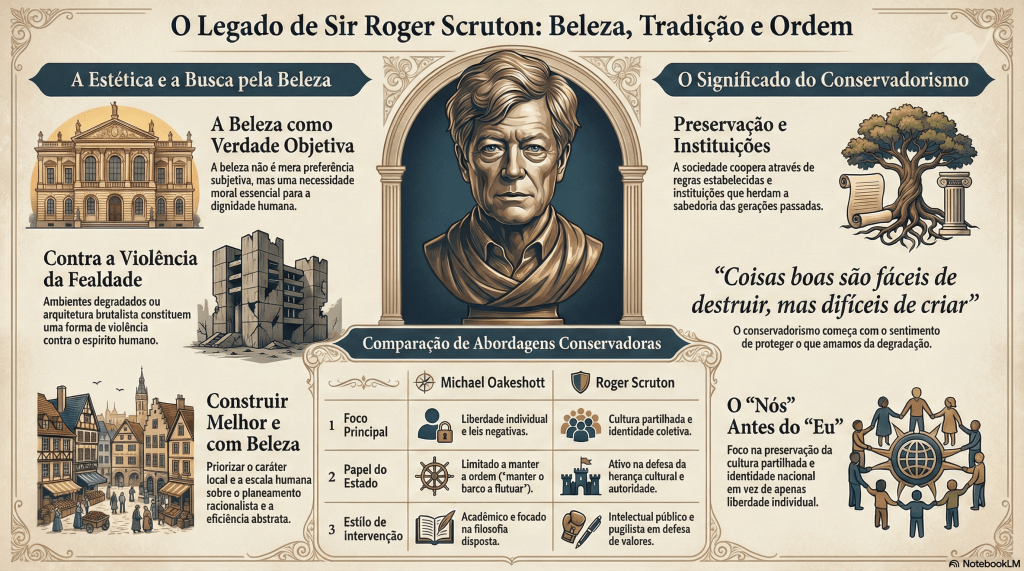 Scruton transforma a beleza de um luxo opcional em uma obrigação moral e uma necessidade para a dignidade e o florescimento humano. Ele defende que permitir que a feiura domine nossos ambientes — seja por meio da arquitetura brutalista, espaços públicos degradados ou desprezo pelo design clássico — constitui “uma forma de violência contra a dignidade humana”. A beleza na arquitetura, na arte e nos espaços compartilhados cria um senso de pertencimento e coesão social, fortalecendo os laços que unem as comunidades. Para Scruton, defender a beleza torna-se defender o próprio sagrado; temos o dever moral de criar e preservar coisas belas não como preferências elitistas, mas como alimento essencial para as almas humanas e como resistência ao empobrecimento do significado, da transcendência e da orientação espiritual promovido pela modernidade.