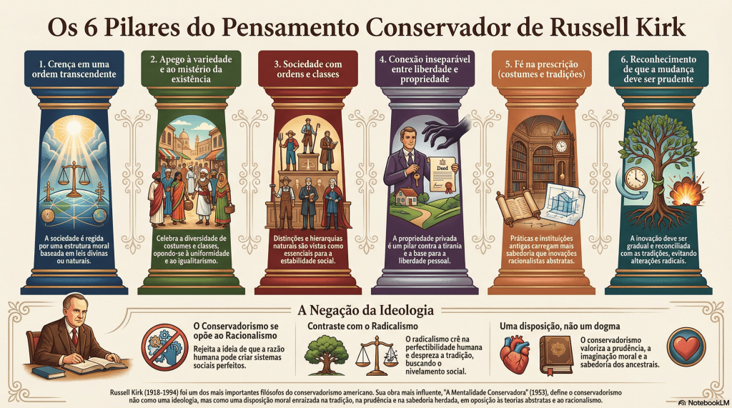 No cerne das ideias de Kirk estão seis “cânones” do pensamento conservador, que ele delineia logo no início do livro como princípios orientadores. Não se tratam de dogmas rígidos, mas de uma síntese de valores duradouros extraídos de conservadores históricos: