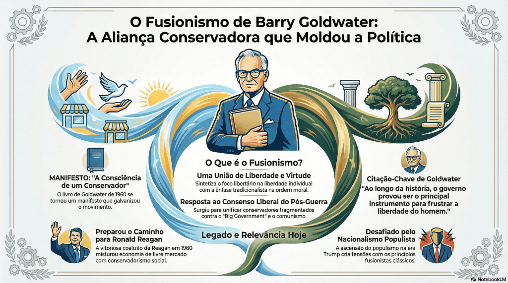 O fusionismo, associado a Barry Goldwater, refere-se a uma filosofia política que sintetiza a ênfase do conservadorismo tradicional na ordem moral, tradição e defesa nacional com o foco do libertarianismo na liberdade individual, mercados livres e intervenção mínima do governo.