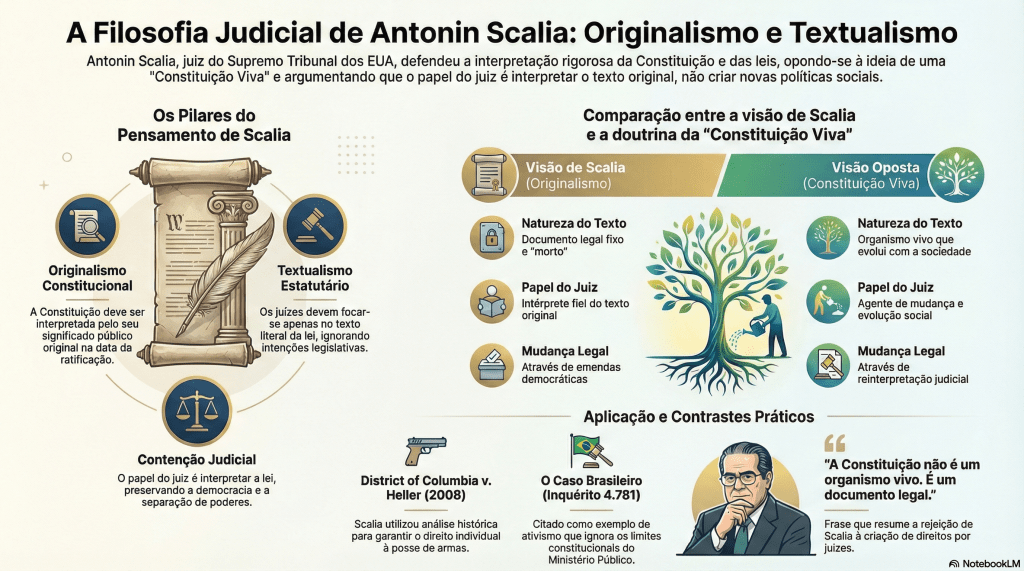 O Juiz Antonin Scalia, que atuou como Juiz Associado da Suprema Corte dos EUA de 1986 até sua morte em 2016, era conhecido por sua filosofia judicial conservadora, que enfatizava a fidelidade à Constituição e aos estatutos como originalmente entendidos. A seguir, descreverei suas principais ideias, com base em seus escritos, opiniões e análises acadêmicas.