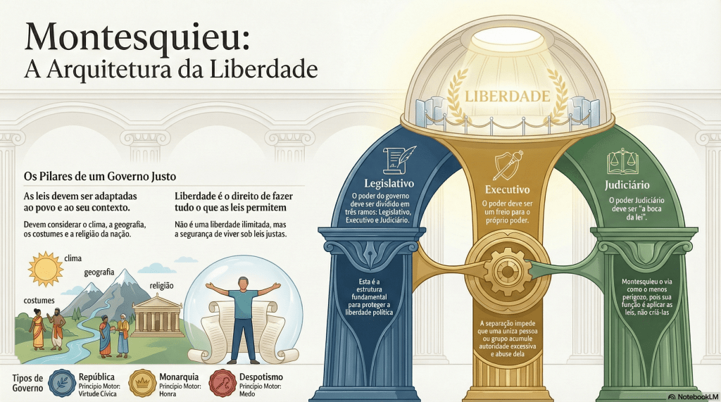 “Liberdade é o direito de fazer tudo o que as leis permitem, e as leis devem ser formuladas de modo a não permitir muito poder nas mãos de uma única pessoa” (O Espírito das Leis, Livro XI, Capítulo 3).