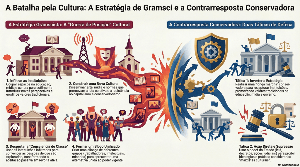 | Contramedidas ao Marxismo Cultural Usando Suas Próprias Propostas Pensadores e organizações conservadoras contemporâneas propõem contramedidas que frequentemente envolvem a recuperação de instituições, a promoção de valores tradicionais e a inversão das estratégias de Gramsci para construir um bloco contra-hegemônico próprio. Abaixo, as principais propostas, agrupadas por tema, com exemplos de autores e organizações. 1. Reivindicar e Infiltrar Instituições (Invertendo a “Longa Marcha Através das Instituições”) Estratégias conservadoras frequentemente espelham a “guerra de posições” de Gramsci, defendendo uma “longa marcha” conservadora para recapturar instituições da sociedade civil, como educação, mídia e governo, do domínio percebido da esquerda. – Projeto 2025 (2022): As propostas incluem a criação de mídias alternativas e think tanks para desafiar narrativas de esquerda, cultivando bases institucionais em igrejas para apoio em massa e desenvolvendo contranarrativas contra o avanço do socialismo. As recomendações incluem o expurgo de 50.000 funcionários federais do governo federal dos EUA, o desmantelamento do Conselho de Política de Gênero, a remoção de termos como “identidade de gênero” das políticas, o desmantelamento de iniciativas de Diversidade, Equidade e Inclusão (DEI) e o tratamento da participação na teoria crítica da raça como motivo para demissão, a fim de restaurar valores tradicionais centrados na família, no casamento e na religião. – Relatório da Heritage Foundation (2022): O relatório se opõe explicitamente à infiltração institucional de Gramsci, instando os conservadores americanos a “se concentrarem localmente” nos níveis estadual e local, financiando candidatos para retomar conselhos escolares e promotorias distritais. Propõe reverter as aquisições educacionais por meio de ações como a limitação de subsídios federais para o ensino superior, o teto dos custos indiretos das universidades, a proibição de declarações obrigatórias de DEI e o auxílio aos empregadores para que diminuam a importância dos diplomas de bacharelado como substitutos do emprego, a fim de enfraquecer as incubadoras marxistas no meio acadêmico. – Debates de confronto de ideias. A estratégia de debate (na qual Charlie Kirk foi um expoente) envolve o engajamento em confrontos de alto nível, muitas vezes virais, em campi universitários, onde se desafia diretamente ideologias esquerdistas, marxistas ou progressistas por meio de debates estruturados, sessões de perguntas e respostas e eventos de oratória com o objetivo de mobilizar jovens conservadores, expor falhas percebidas nos argumentos dos oponentes e promover valores tradicionais como responsabilidade pessoal e princípios de livre mercado. Mas não apenas isso. Como os esquerdistas radicais são aversos a um debate honesto, dar aos estudantes a oportunidade de compreender o que é um debate nesses moldes, muda a sua forma de pensar. – Brasil Paralelo. A estratégia da Brasil Paralelo concentra-se na produção e distribuição de documentários, séries e conteúdo educacional revisionistas que contrariem narrativas históricas esquerdistas no Brasil, como a reinterpretação de eventos como o golpe militar de 1964 ou a crítica ao marxismo cultural, para promover uma mudança cultural conservadora por meio da mídia e do discurso intelectual. 2. Proibições Políticas e Legislativas de Práticas Ideológicas Enfatizar ações legais e executivas para proibir mudanças culturais inspiradas em Gramsci, como a teoria crítica da raça (TCR) ou a ideologia de gênero, que os críticos veem como ferramentas para erodir a hegemonia burguesa. – Relatório da Heritage Foundation (2022): Propor a aprovação de uma legislação estadual para proibir a TRC e a teoria de gênero em salas de aula do ensino fundamental e médio, estabelecendo direitos parentais e redirecionando o financiamento para o acompanhamento dos alunos em vez das instituições. Em nível federal, o próximo presidente deve emitir decretos executivos visando o status de faculdades sem fins lucrativos que promovam “políticas racistas”, como formaturas segregadas ou violações da liberdade de expressão. Além disso, proteger os direitos parentais, anexando legislação protetiva a projetos de lei de aprovação obrigatória e incentivando ações judiciais contra práticas médicas antiéticas de “afirmação de gênero”. – Desmantelamento da Taxonomia Racial: O relatório sugere a eliminação das categorias raciais governamentais, revogando a Diretiva nº 15 do Escritório de Administração e Orçamento dos EUA, dissolvendo comitês consultivos relacionados e redirecionando as perguntas do censo para a ascendência nacional, a fim de minar as divisões baseadas em queixas. 3. Promover Valores Tradicionais e Religiosos como Defesa Ideológica Baseando-se em cosmovisões cristãs ou conservadoras para reforçar as normas do “senso comum” contra a ênfase de Gramsci na transformação cultural. – Instituto para a Fé e a Cultura (Allen Mashburn, 2023): Mashburn propõe que os cristãos “reúnam informações para se engajar em uma sociedade permeada pela impiedade”, citando Colossenses 2:8 para alertar contra o cativeiro de filosofias e tradições mundanas. Isso implica esforços educacionais e adesão aos princípios bíblicos como defesa, rejeitando a infiltração de ideias marxistas em igrejas e famílias. – Turning Point USA Faith Resource (década de 2020): Proclamar a “unidade bíblica em Cristo” (Gálatas 3:28) para combater grupos identitários fragmentados, abordando questões como o racismo com oportunidades evangélicas, ao mesmo tempo em que rejeita a eliminação da responsabilidade individual, que atribui os problemas exclusivamente à hegemonia cultural. Isso defende Gramsci contra a responsabilidade pessoal e a unidade em detri