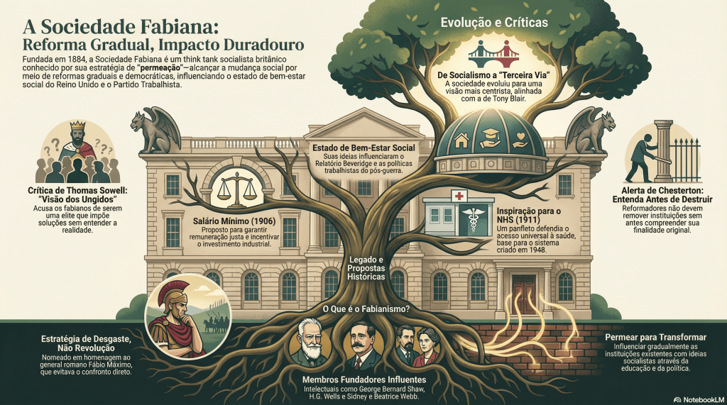 2. Como a estratégia fabiana de “permeação” — infiltrar as instituições existentes com ideias socialistas — se compara às táticas contemporâneas de movimentos políticos que buscam transformação por meio do sistema estabelecido?