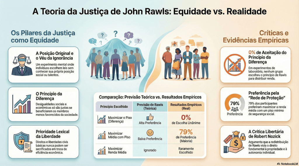 | O que os Experimentos Têm a Dizer sobre os Teorias de Justiça Norman Frohlich e Joe A. Oppenheimer, frequentemente em colaboração com Cheryl L. Eavey, ofereceram uma crítica empírica significativa à teoria da justiça de John Rawls, particularmente aos seus pressupostos fundamentais sobre a tomada de decisões na “posição original” por trás do “véu da ignorância”. Seu trabalho, detalhado em publicações como o artigo de 1987 no American Journal of Political Science e o livro de 1992, Choosing Justice: An Experimental Approach to Ethical Theory, utilizou experimentos de laboratório para testar se pessoas reais, colocadas em condições que simulassem o cenário hipotético de Rawls, realmente selecionariam seus princípios de justiça propostos. Para avaliar empiricamente a teoria de Rawls, Frohlich e Oppenheimer projetaram experimentos que imitavam a imparcialidade da posição original por meio de “informações imperfeitas”. Os participantes (tipicamente estudantes universitários) foram divididos em pequenos grupos (por exemplo, 4 a 5 pessoas) e incumbidos de chegar a um acordo unânime sobre um princípio para a distribuição de renda em uma sociedade hipotética. Eles foram informados de que seus ganhos reais com o experimento seriam determinados pelo princípio escolhido, mas não saberiam sua produtividade individual ou posição na distribuição de renda até depois da decisão — reforçando um véu de ignorância. Os participantes classificaram e discutiram quatro possíveis princípios distributivos: – Maximizar a renda mínima (princípio da diferença de Rawls, ou maximin: garantir que os mais desfavorecidos recebam o mínimo possível). – Maximizar a renda média (utilitarista: focar na riqueza social geral sem levar em conta a distribuição). – Maximizar a média com uma renda (uma rede de segurança mínima, acima da qual as desigualdades podem maximizar as médias). – Maximizar a média com uma restrição de amplitude (limitar a diferença entre os mais ricos e os mais pobres). As discussões foram estruturadas para incentivar o consenso, e as variações incluíram recompensas de maior risco, cenários com perdas potenciais e diferentes tamanhos de grupo para testar a robustez. Em múltiplos experimentos (por exemplo, 44 grupos em um estudo), os resultados contradisseram consistentemente as previsões de Rawls: – Alto Consenso: Os grupos quase sempre alcançaram um acordo unânime (100% em alguns projetos), apoiando a ideia de Rawls de que o raciocínio imparcial pode levar ao consenso. – Rejeição do Princípio da Diferença: Nenhum grupo jamais selecionou o princípio da minimax de Rawls. Foi o menos popular, recebendo o menor número de classificações em primeiro lugar (apenas 9 entre centenas) e o maior número de classificações em último lugar (106). Os participantes o consideraram excessivamente restritivo e ineficiente. – Preferência por um Princípio “Intuicionista”: A esmagadora maioria (79% dos grupos, ou 35 de 44 em um experimento) dos participantes optou por maximizar a renda média com uma renda mínima de piso para proporcionar uma rede de segurança Este experimento extremamente importante sugere que, embora discussões filosóficas teóricas sobre justiça possam ser interessantes, pessoas reais podem não concordar com o que as elites ‘esclarecidas” pensam sobre o que é justiça. |