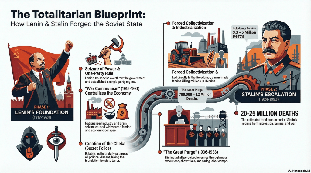 The USSR’s evolution into a totalitarian state began under Lenin but intensified under Stalin.