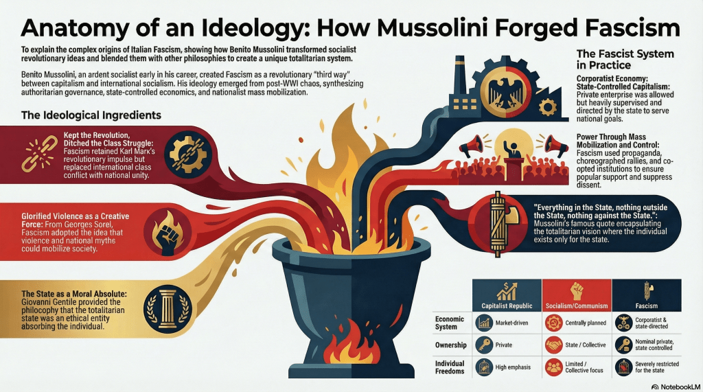 The pivotal transformation in Mussolini’s political orientation occurred during World War I, when he became “a proponent for the war effort”. This shift marked the beginning of his movement away from orthodox socialism toward what would eventually become fascism. This transformation was not merely opportunistic but reflected a genuine ideological evolution that saw Mussolini rejecting the internationalist aspects of socialism while retaining its revolutionary methodology, mass mobilization techniques and strong aversion of free market economies.