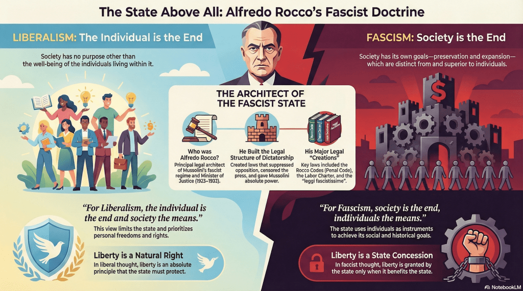 Alfredo Rocco’s 1926 essay “The Political Doctrine of Fascism” (originally a speech) serves as a foundational ideological text for Italian Fascism, endorsed by Benito Mussolini as a masterful exposition of its principles. The work critiques modern liberal, democratic, and socialist doctrines while articulating Fascism as a coherent alternative rooted in an organic, state-centric view of society.