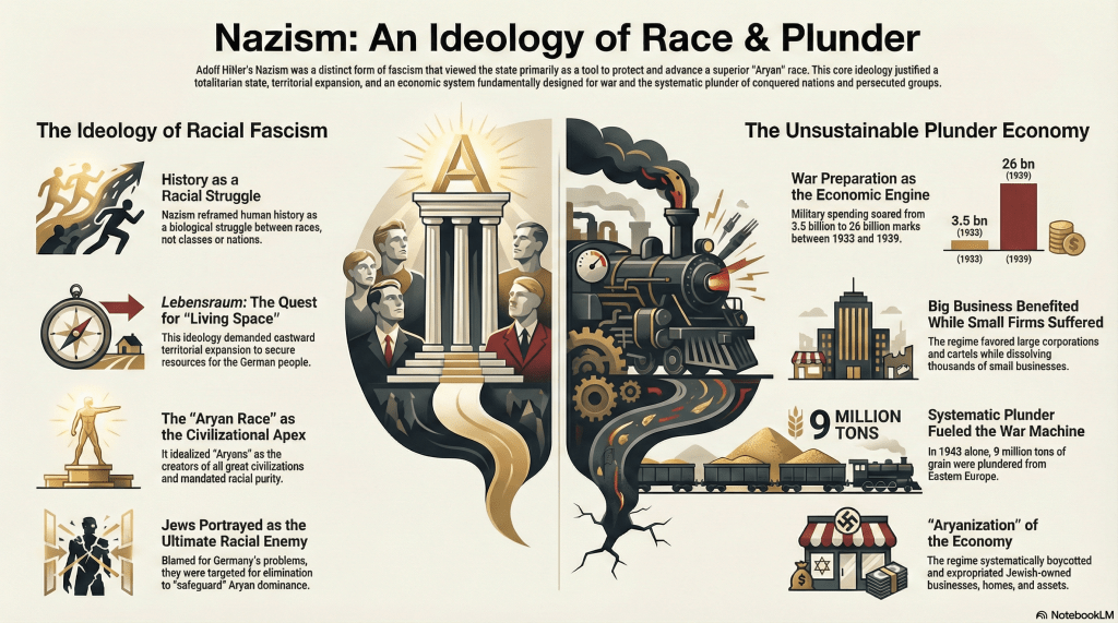 In German fascism or Nazism, race was not just an aspect, but the foundational element that distinguished it as a racial nationalism instead of a purely political movement. Hitler integrated race into all facets of ideology and governance, viewing the state as a tool to protect and advance the Aryan Volk (people’s community), with a biological determinism that organized society in a racial hierarchy: Aryans at the top, with Germans as the purest form, followed by other Europeans, and “subhumans” like Jews and Slavs at the bottom. Racial purity was essential for national survival, leading to policies of population “purification” through exclusion, forced labor and genocide, emerging from Hitler’s early influences by Social Darwinism, which he adapted into a program of racial war.