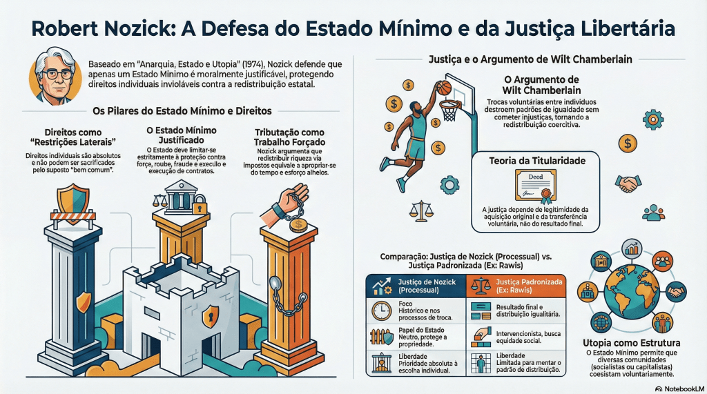 Sua obra mais influente, Anarquia, Estado e Utopia (1974), é um texto fundamental na política libertária, servindo como uma resposta direta à teoria igualitária da justiça de John Rawls. Dividido em três partes, o livro defende um Estado mínimo que protege os direitos individuais sem se envolver em redistribuição ou paternalismo. Nozick parte de um estado de natureza lockeano, enfatizando os direitos individuais invioláveis como restrições laterais que não podem ser sobrepostas em prol de objetivos coletivos. Central para seu argumento é a “teoria da titularidade” da justiça, que postula que uma distribuição é justa se resultar de aquisições justas e transferências voluntárias, rejeitando teorias padronizadas como a igualdade ou o utilitarismo, que exigem intervenção constante.