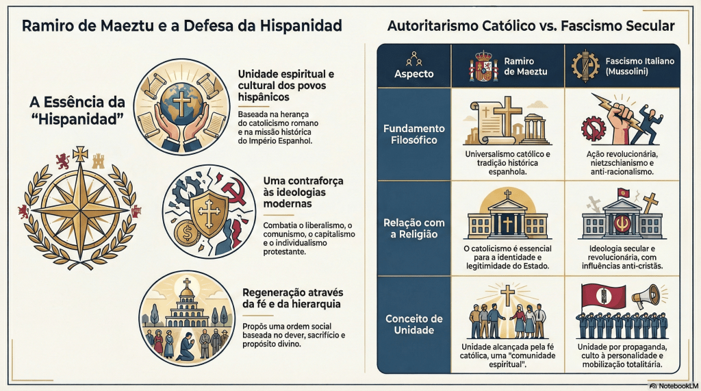 | Fundamentação Filosófica | Ação revolucionária; antiegalitarismo nietzschiano; rejeição do racionalismo liberal | Teoria constitucional e corporativista; rejeição da soberania popular; Estado como mecanismo consultivo que testa o sentimento das massas. | Universalismo católico; tradição histórica espanhola; regeneração espiritual por meio da autoridade política. |